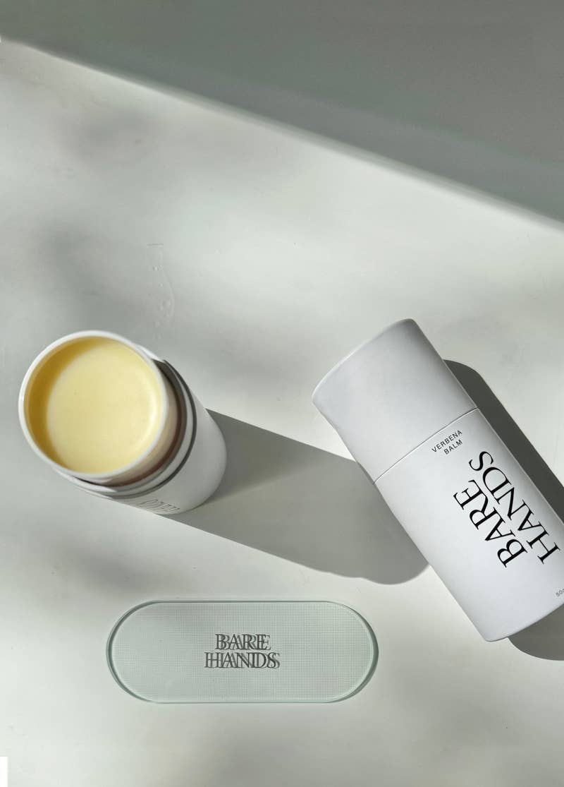 The Verbena Balm is an occlusive-forward formula, using natural plant oils, butters, and extracts: Cocoa butter is high in tocopherol content. (Antioxidant, collagen boosting). Calendula extract helps draw moisture into the skin. Beeswax’s soothing properties come from esters and free fatty acids, Castor oil is high in Oleic acid and works as both an emollient and an occlusive to soften skin texture.