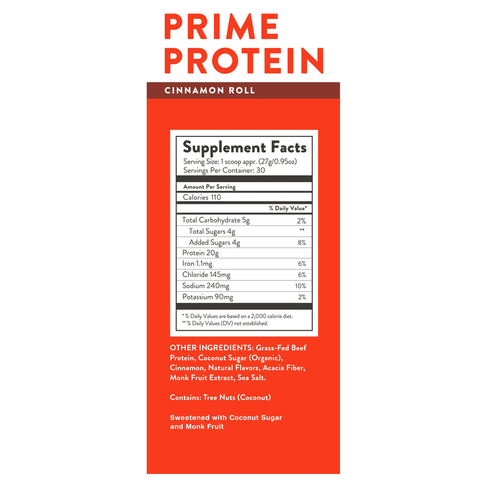 This Cinnamon Roll Prime blend contains just 7 ingredients — grass-fed beef protein, organic coconut sugar, cinnamon, natural flavors, acacia fiber, monk fruit extract, and sea salt — and delivers a robust amino acid profile.