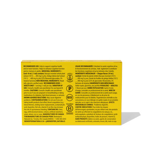 MEDICINAL INGREDIENTS: Each 10 mL (1 vial) contains: Bacopa monnieri whole plant extract (10:1), 300 mg 3 g dry, Ginkgo biloba leaf extract (10:1), 400 mg 4 g dry (22% flavonoid glycosides, 5% terpene lactones)