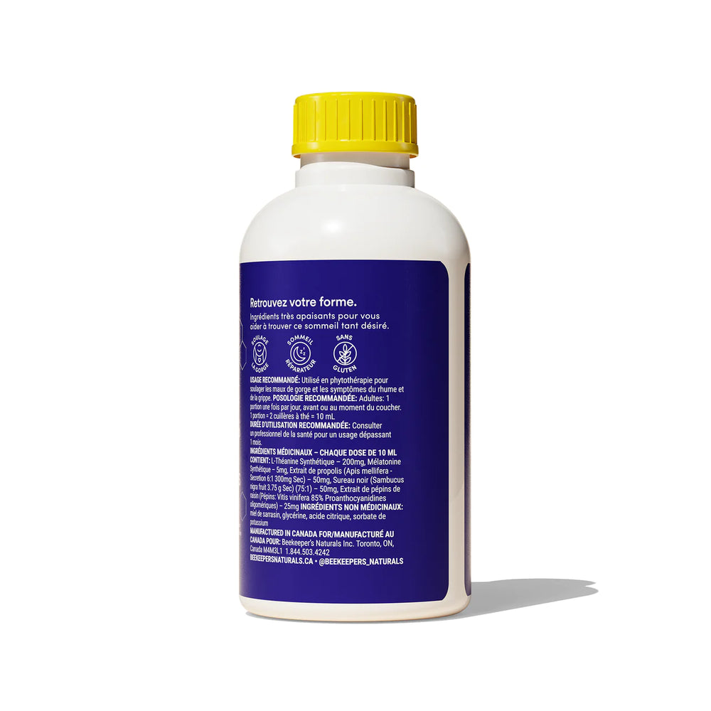 MEDICINAL INGREDIENTS - EACH 10ML DOSE CONTAINS: L-Theanine Synthetic - 200mg, Melatonin Synthetic - 5mg, Propolis Extract (Apis mellifera-Secretion 6:1 300 mg Dry) - 50mg, Black Elderberry (Sambucus nigra fruit 3.75 g Dry) (75:1) - 50mg, Grape Seed Extract (Vitis vinifera: Seed 85% Oligomeric proanthocyanidins) - 25mg