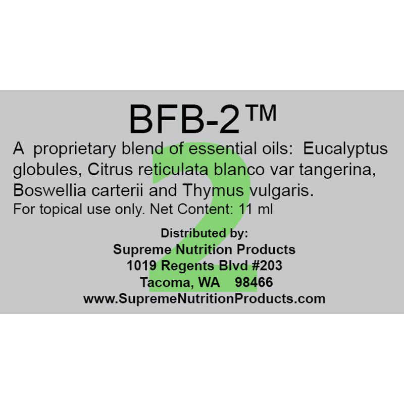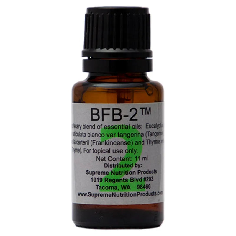 BFB-2™ contains 11 ml of a proprietary blend of Eucalyptus globules, Citrus reticulata blanco var tangerina, Boswellia carterii, and Thymus vulgaris. Adults: Day 1: Place 1 drop on the bottom of each big toe, morning and evening. Day 2: Continue to apply one drop on the bottom of each big toe, and add 1 drop on each thumb pad morning and evening. Day 3: In addition to the big toes and thumbs, apply 1 drop on back of each ear lobe, morning and evening. If well tolerated after a few days, oils can be applied directly to areas of concern, but only externally. If a rash develops, try using a carrier oil such as coconut or olive. Mix the BFB oils with the carrier oil, then apply. If using both BFB-1 and BFB-2 at the same time, alternate BFB-1 on one side of the body and BFB-2 on the other as directed above. Children under 12: 1 drop onto the sole of one foot, once daily for the first 3 days, and if tolerated, increase to one drop on the bottom of both feet twice daily. If using both oils, put one drop of BFB1 on sole of right foot, and one drop of BFB2 on sole of left foot once a day. If tolerated, increase to twice daily, alternating feet each time.