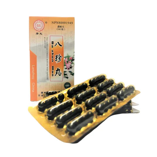 Ba Zhen Wan is a Traditional Chinese Medicine that is used for general Qi and blood tonic, especially popular among women in China. It can be used to treat deficiencies of Qi and blood that cause dry hair and skin, palor and dizziness. Useful to treat anemia, weakness, and irregular periods. Speed recovery after surgery, illness, or childbirth*