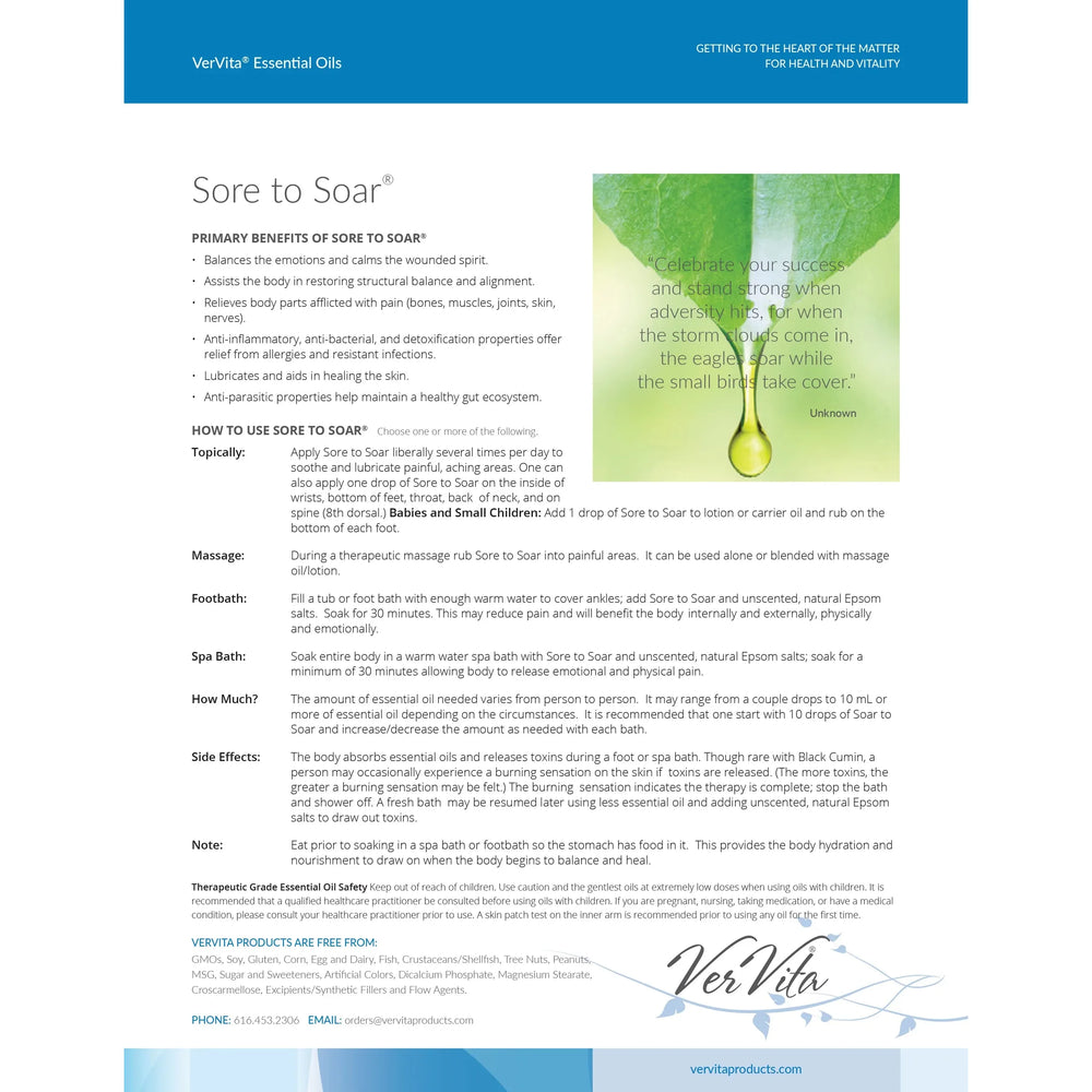 Sore to Soar offers a harmonious synergy of essential oils including Ho Wood, spruce, blue tansy, and frankincense. These therapeutic-grade essential oils are combined to assist the body in getting relief from physical pain, and emotional pain that is revealed as fear and anger.