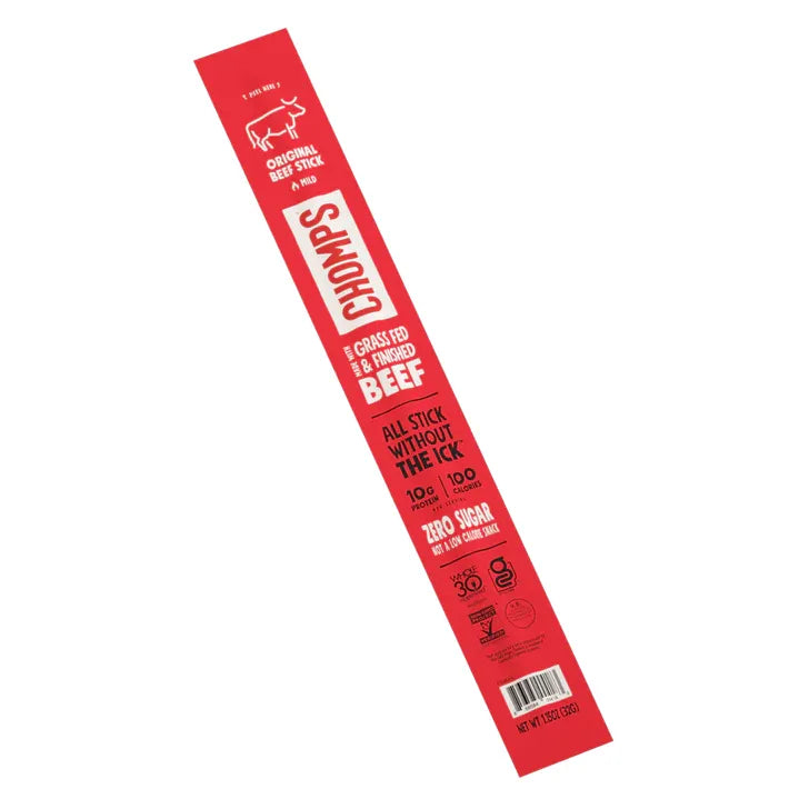CHOMPS Original Meat Sticks are made with simple, high-quality ingredients: 100% Grass-Fed & Finished Beef, Sea Salt, Black Pepper, Celery, Red Pepper, and Garlic. No sugar, no seed oils, no artificial anything.