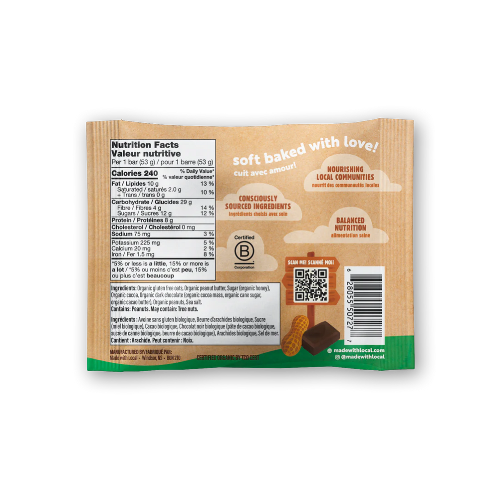 Gluten-free organic oats, Organic peanut butter, Sugar (organic honey), Organic cocoa, Organic dark chocolate (cocoa mass, cane sugar, cacao butter), Peanuts, Sea salt.