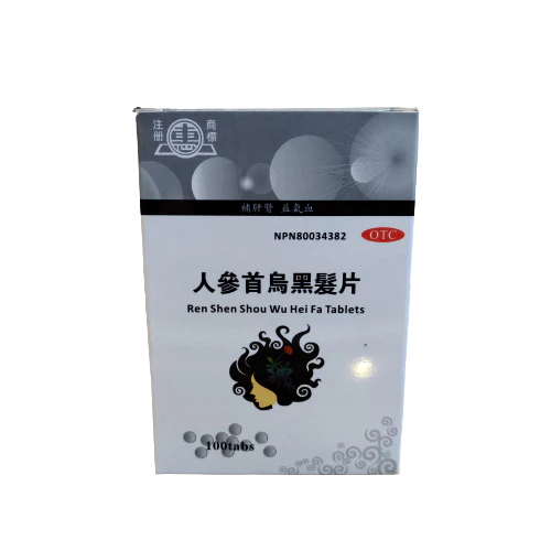 Ren Shen Shou Wu Hei Fa Tablets is a Traditional Chinese Medicine used to nourish the liver and kidney, and replenish Qi energy, blood and fluid deficiency. It is used in TCM for insomnia, poor appetite and early graying of hair.*
