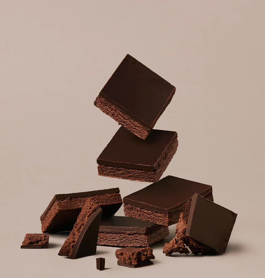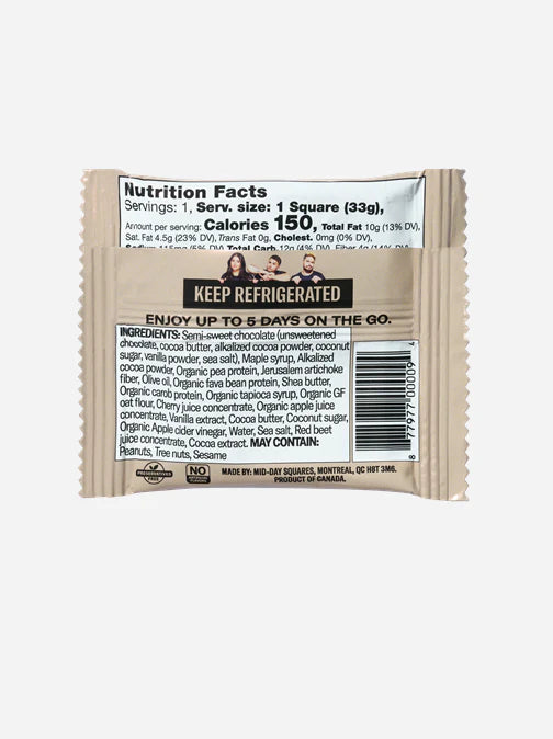 Dark chocolate (unsweetened chocolate, cocoa butter, alkalized cocoa powder, coconut sugar, vanilla powder, sea salt), Sugars (maple syrup, organic tapioca syrup, cherry juice concentrate, organic apple juice concentrate, coconut sugar, red beet juice concentrate), Alkalized cocoa powder, Organic pea protein, Jerusalem artichoke fiber, Olive oil, Organic fava bean protein, Shea butter, Organic carob protein, Organic GF oat flour, Vanilla extract, Cocoa butter, Organic Apple cider vinegar, Water, Sea salt, Cocoa extract.