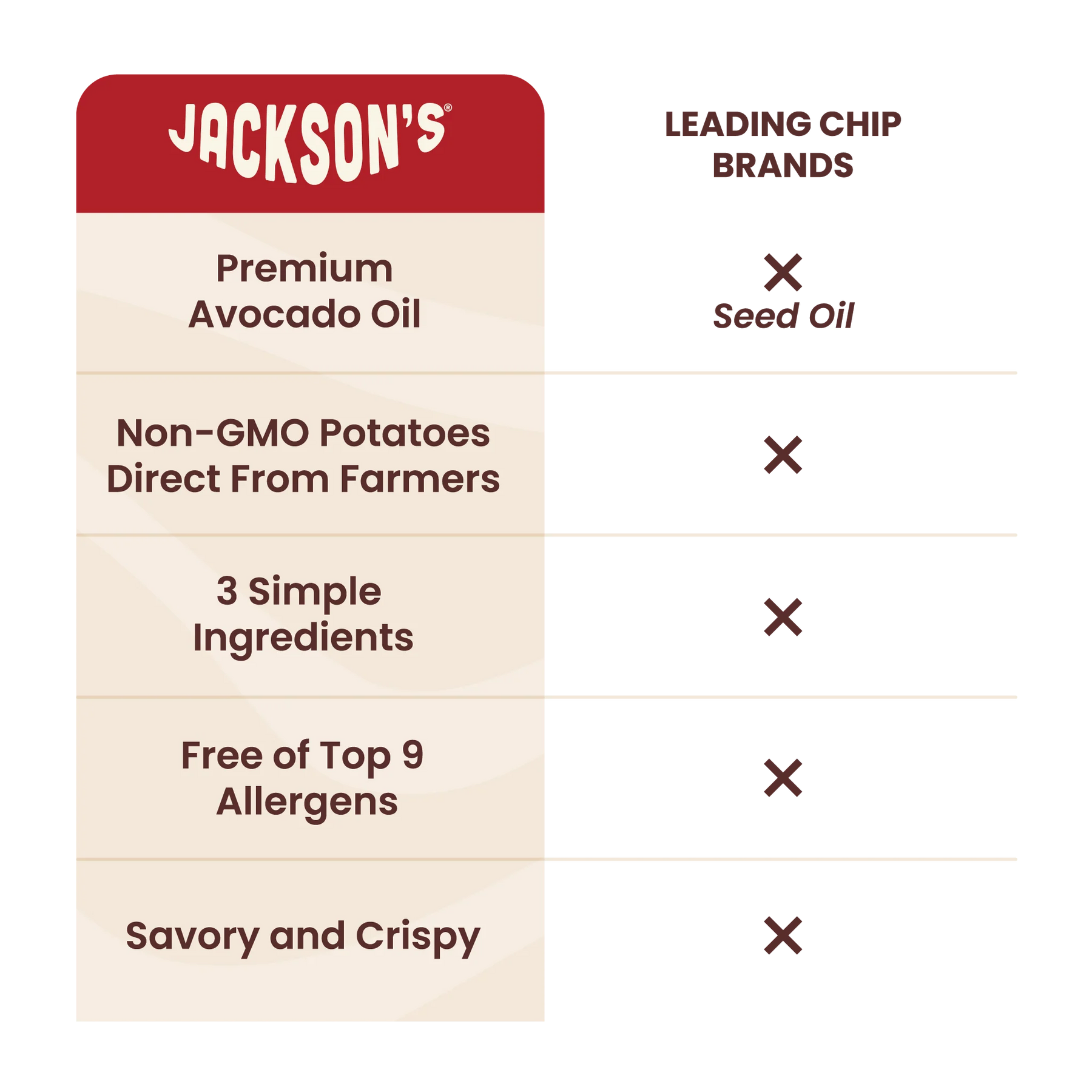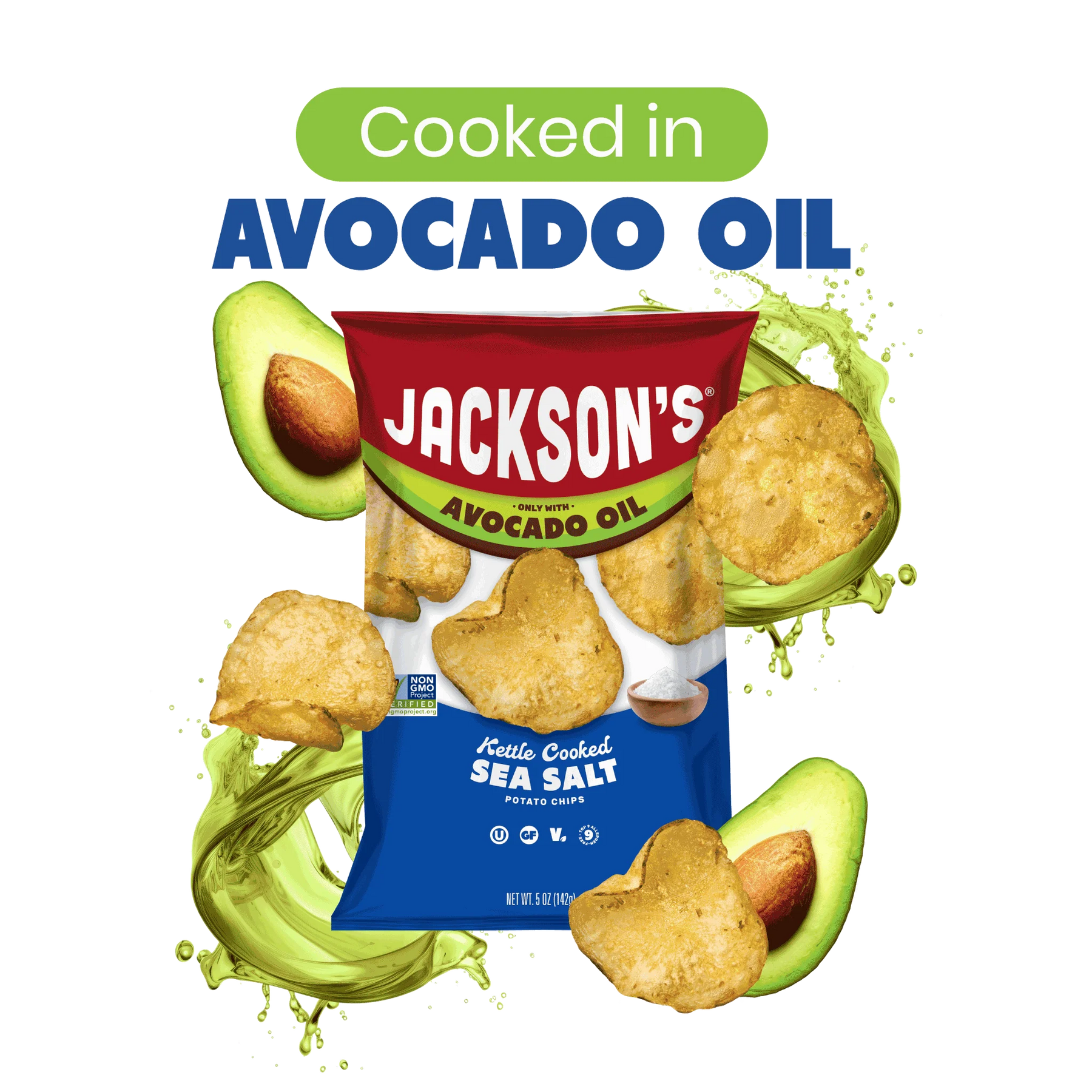 Upgrade your snack game with Jackson's Kettle Chips – a guilt-free indulgence that combines non-GMO potatoes, sea salt, and premium avocado oil for a crispy, golden bite that satisfies your cravings and fuels your body with antioxidant-rich, better-for-you fats.